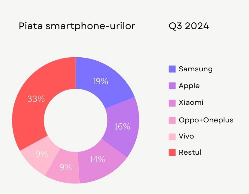 2. Apple a reusit sa comercializeze 17,41 mln de telefoane, asigurandu-si o cota de piata de 16%. Insa daca e sa ne raportam la ultimele 12 luni, tot Apple ramane cel mai mare producator. Cu toate acestea, daca se pastreaza tendinta actuala, s-ar putea ca 2024 sa fie anul Samsung, mai ales ca modelele din gama S24 se bucura de o popularitate impresionanta. Producatorul american insa isi pune sperantele in noua gama iPhone 16, care ar trebui sa aiba un impact pozitiv asupra vanzarilor, datorita imbunatirilor pe partea de hardware, dar si multumita integrarii AI.